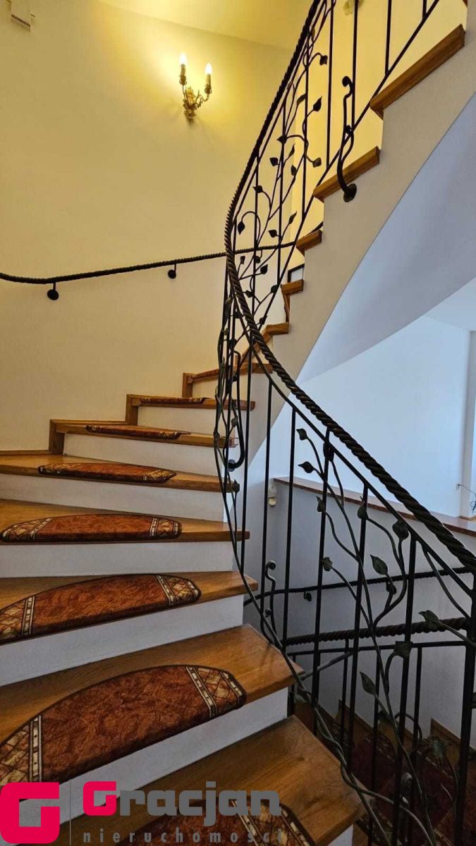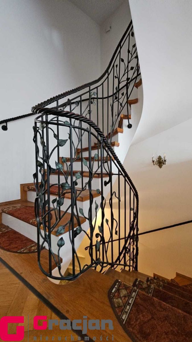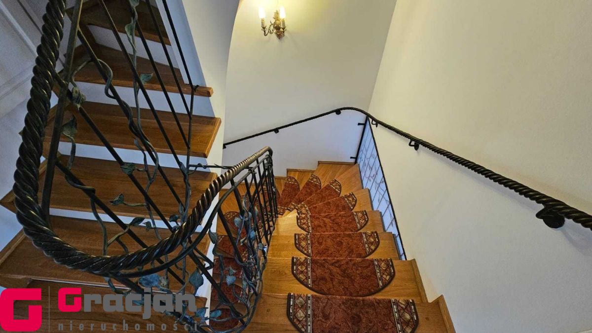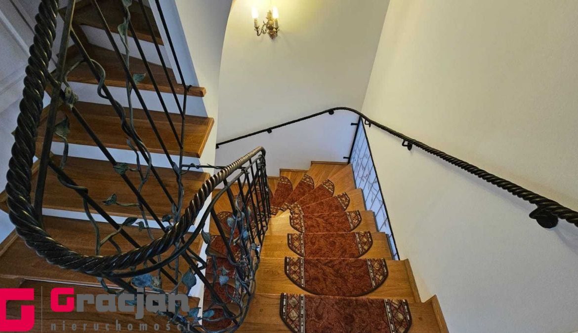 Na wysoki parter prowadzą nas reprezentacyjne schody pokryte drewnem połączonym z nietuzinkową i rzadko spotykaną metaloplastyką balustrad i poręczy , dalej wchodzimy do obszernego salonu ok 30 m2 z wyjściem na taras (20 m2) i ogród oraz przestronnego hallu z wejściem do garderoby i wc , prowadzącego do odrębnej części kuchni i jadalni ( ok 20 m 2) ze spiżarnią oraz wyjściem na obszerny balkon na szerokości całego budynku. Podłogi na tej kondygnacji wykończone wysokiej jakości parkietem.