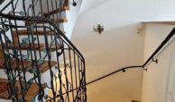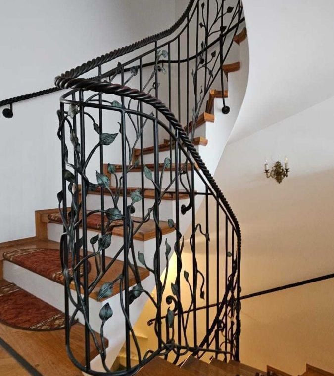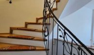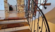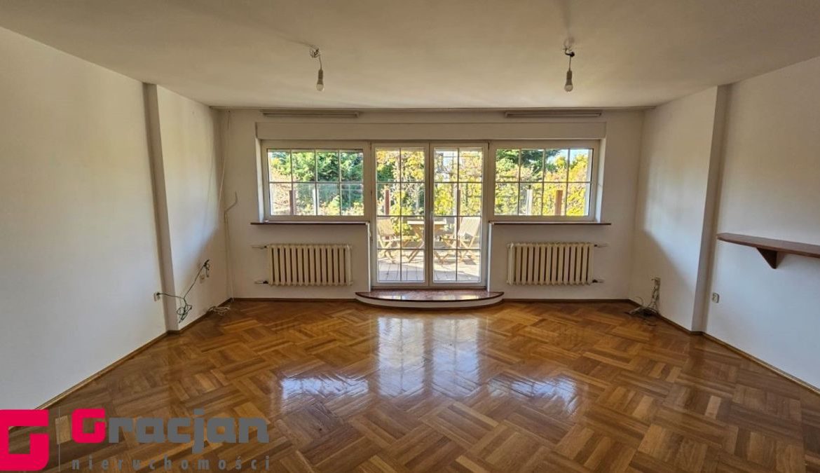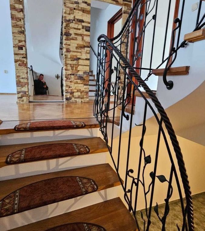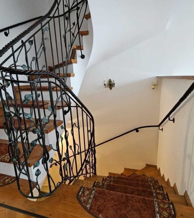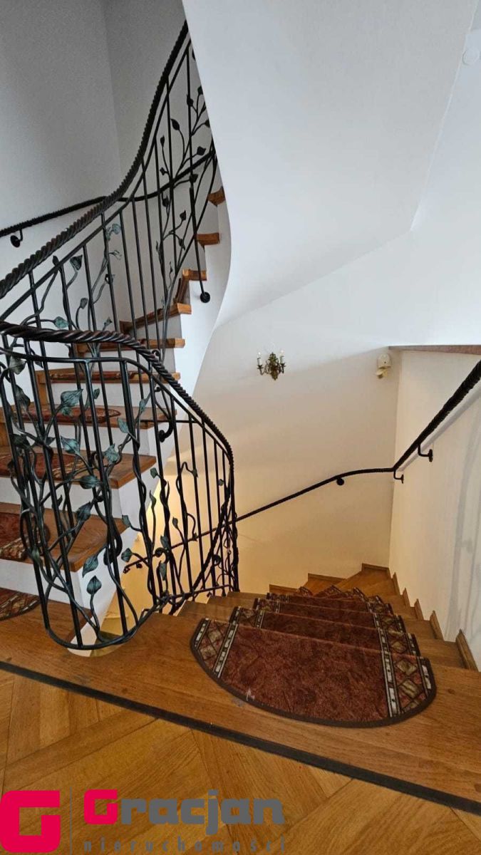 Na wysoki parter prowadzą nas reprezentacyjne schody pokryte drewnem połączonym z nietuzinkową i rzadko spotykaną metaloplastyką balustrad i poręczy , dalej wchodzimy do obszernego salonu ok 30 m2 z wyjściem na taras (20 m2) i ogród oraz przestronnego hallu z wejściem do garderoby i wc , prowadzącego do odrębnej części kuchni i jadalni ( ok 20 m 2) ze spiżarnią oraz wyjściem na obszerny balkon na szerokości całego budynku. Podłogi na tej kondygnacji wykończone wysokiej jakości parkietem.
