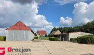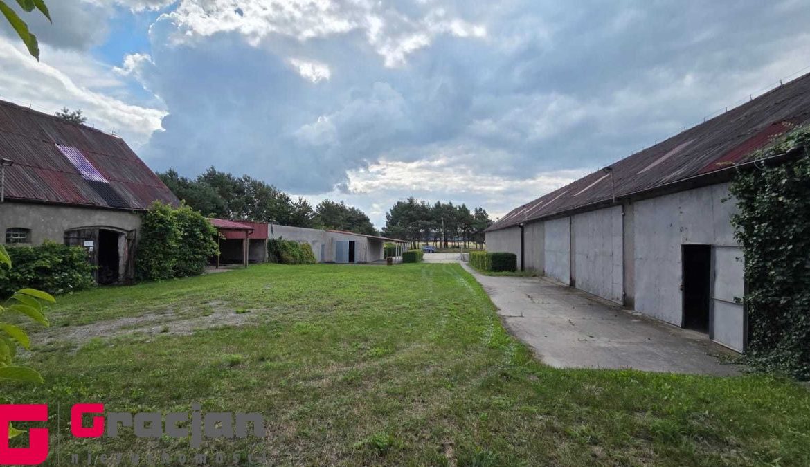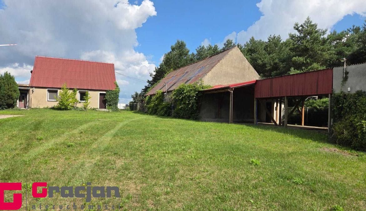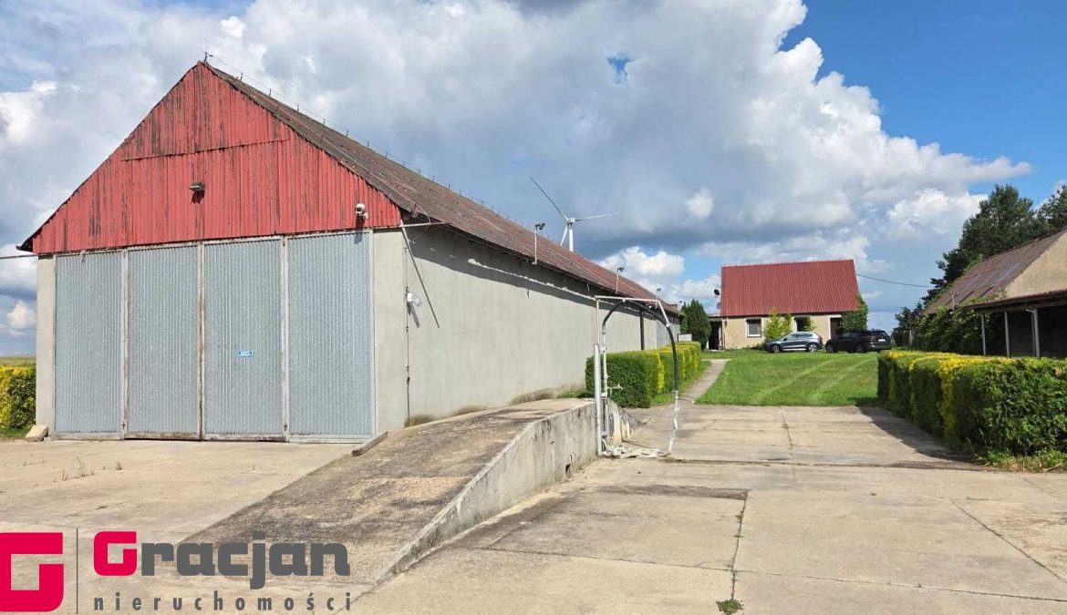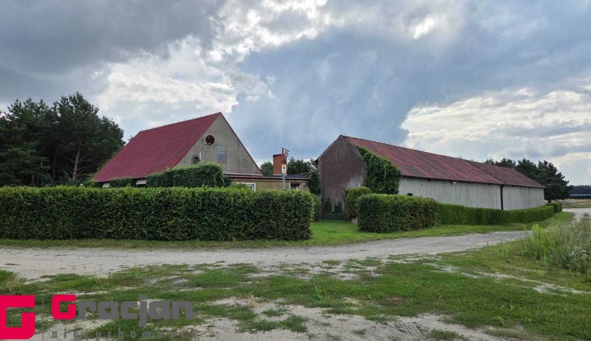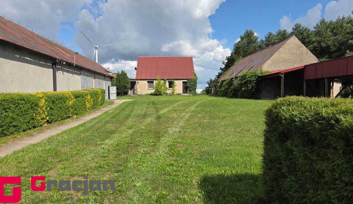 Budynek mieszkalny z lat 60 tych do remontu z centralnym ogrzewaniem na ekogroszek – 4 pokoje , kuchnia , łazienka + poddasze do adaptacji . Dodatkowo budynek magazynowy 422 m2 , drugi 150 m2 i trzeci 120 m2.