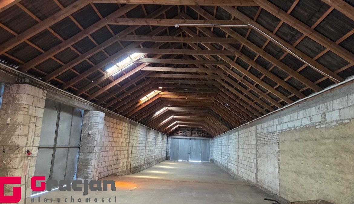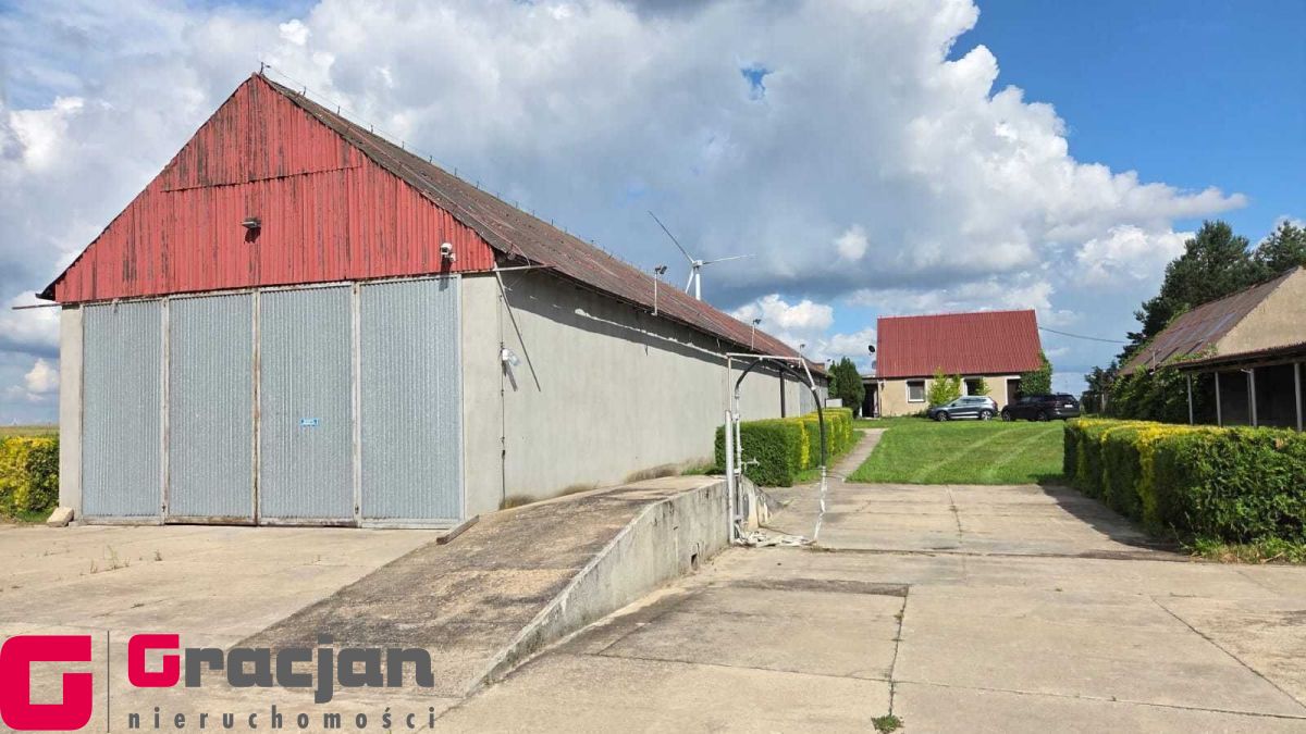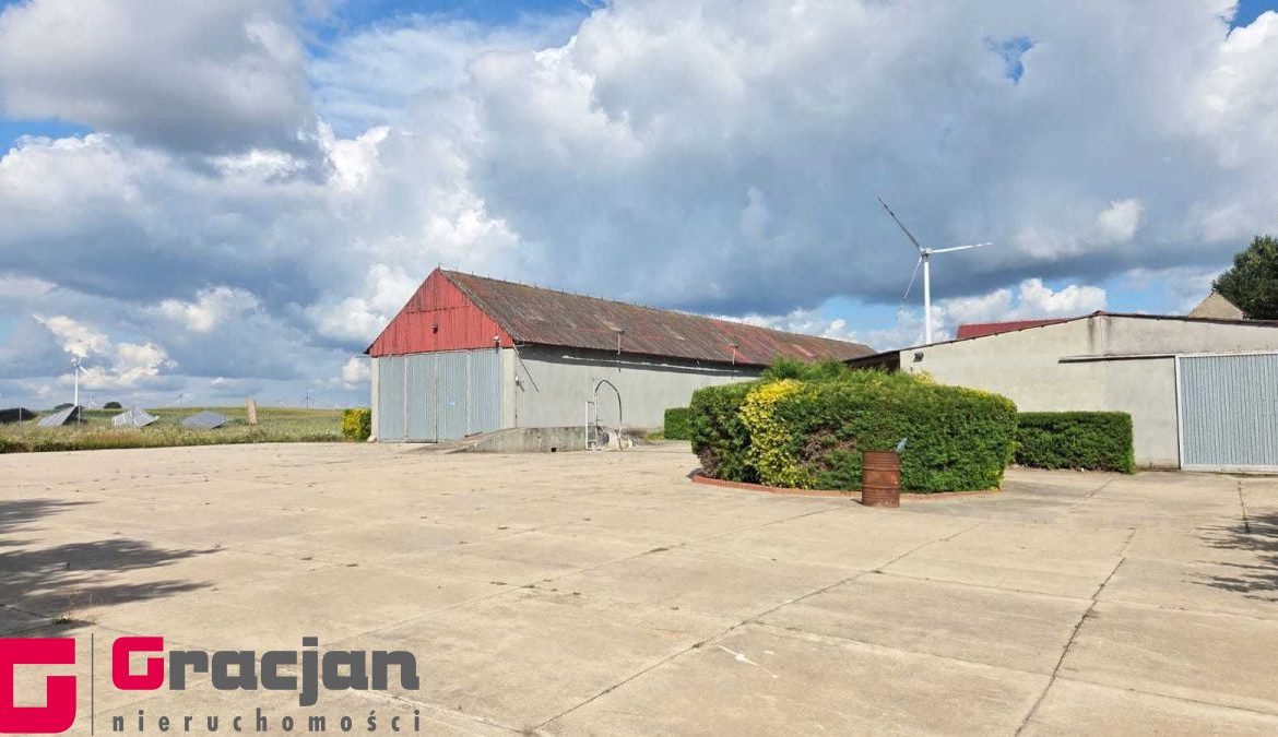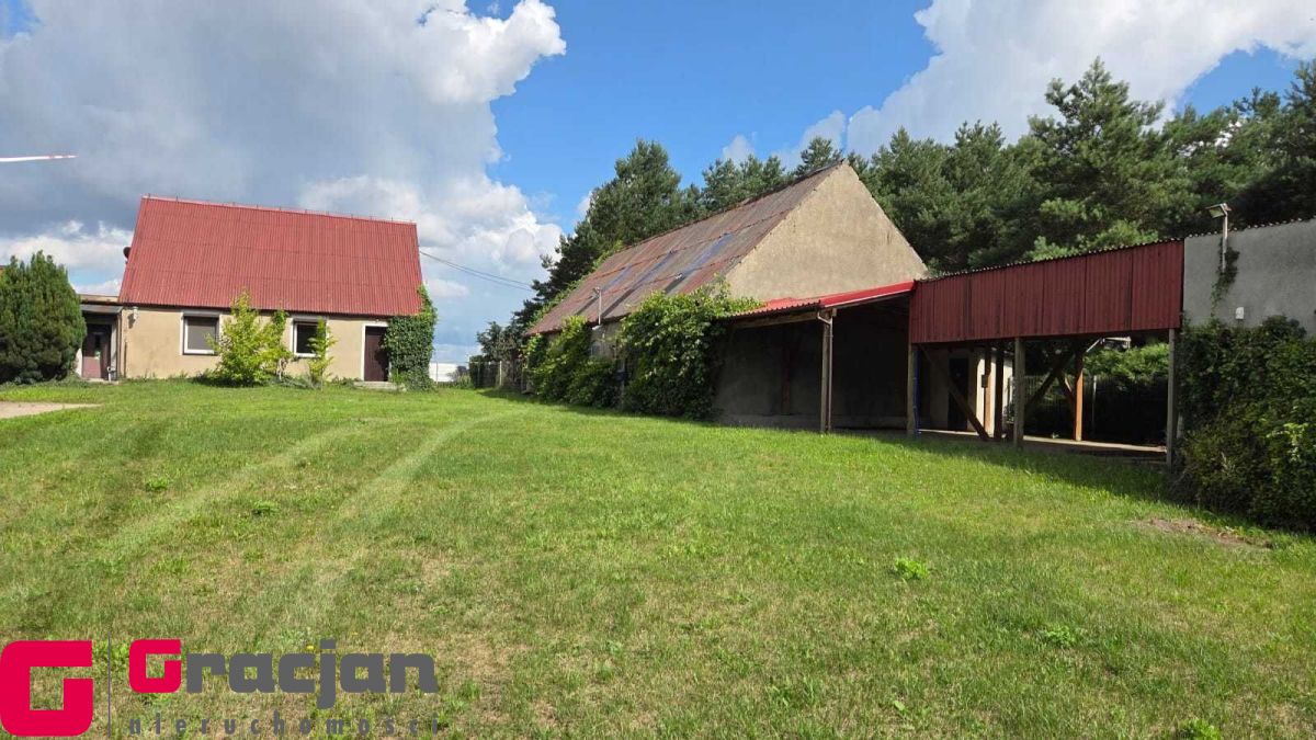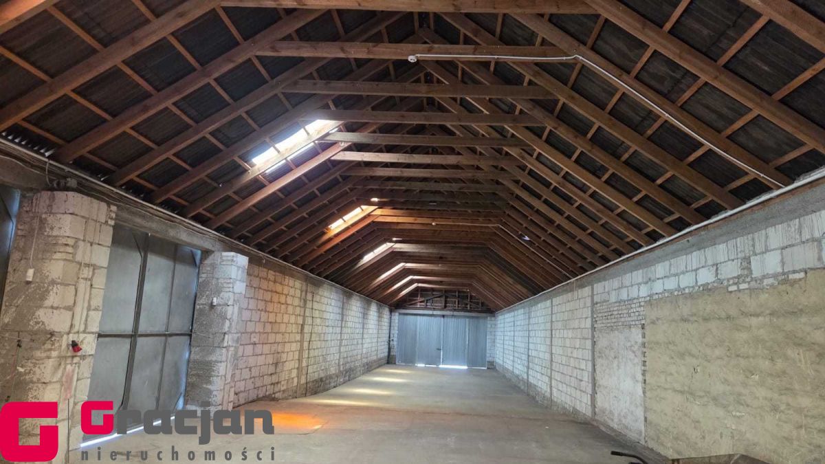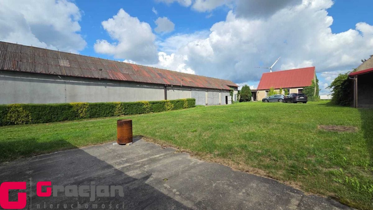 Budynek mieszkalny z lat 60 tych do remontu z centralnym ogrzewaniem na ekogroszek – 4 pokoje , kuchnia , łazienka + poddasze do adaptacji . Dodatkowo budynek magazynowy 422 m2 , drugi 150 m2 i trzeci 120 m2.