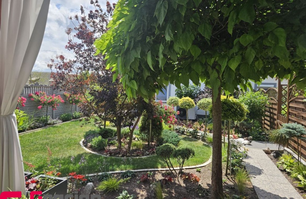 Na zagospodarowanej działce zlokalizowano budynek mieszkalny, garaż wolnostojący dwustanowiskowy ok.100 m2, wysokość 3m i domek gospodarczy/dla gości, teren częściowo wyłożony kostką, częściowo zaaranżowany pięknym ogrodem. Każde z mieszkań posiada niezależne wejście po przeciwnych stronach budynku, co umożliwia wygodne funkcjonowanie dla dwóch rodzin.