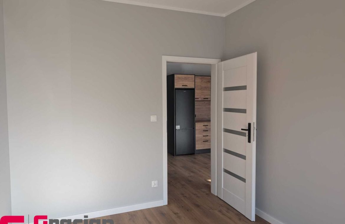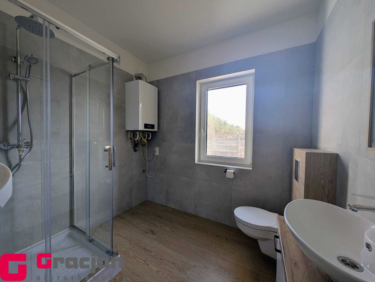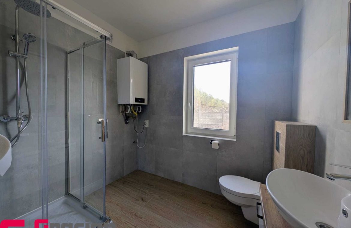 Umeblowana i wyposażona kuchnia i łazienka, szafa garderobiana w korytarzu, własne ogrzewanie gazowe podłogowe  – piec II funkcyjny