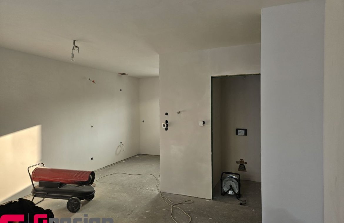– ściany wewnętrzne ocieplone wełną 15cm z okładzinami płyta osb oraz płytą gk z wyszpachlowaniem łączeń płyt gk