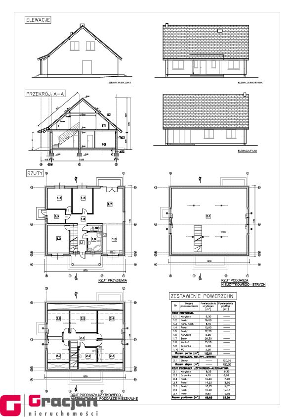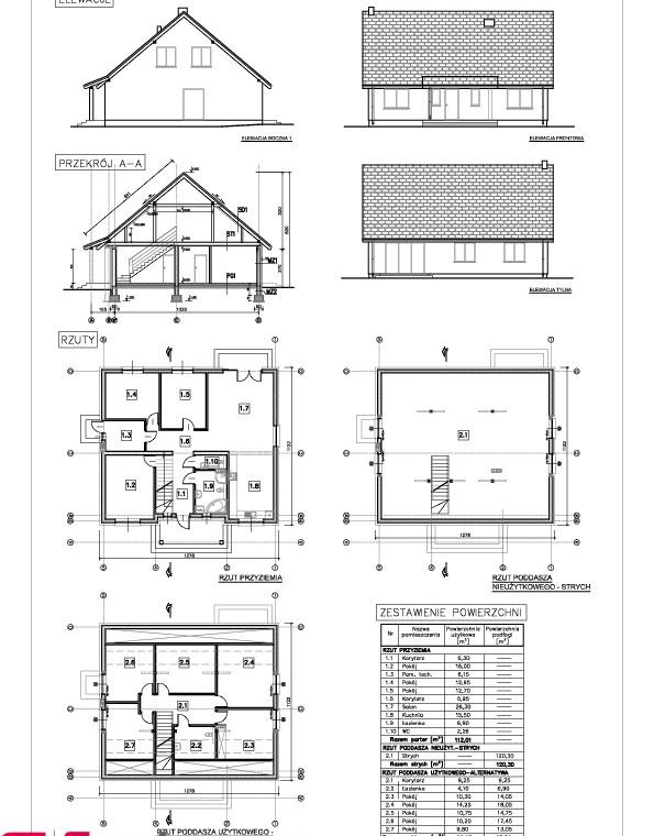 Funkcjonalny układ pomieszczeń, w skład którego wchodzą trzy niezależne sypialnie ( 16,13 i 12 m2), salon 26m2 oraz półotwarta kuchnia ( z możliwością całkowitego zamknięcia ścianką) o pow.15,5 m2. W domu przewidziano również kotłownię ( z oddzielnym wyjściem na zewnątrz), WC oraz przestronna łazienkę (6,9m2) z wanną oraz prysznicem. W korytarzu sporo miejsca na zabudowę garderobianą lub miejsce na schody w przypadku adaptacji poddasza na cele mieszkaniowe. Projekt umożliwia adaptacje poddasza i powiększenie powierzchni mieszkalnej o ponad 110 m2.